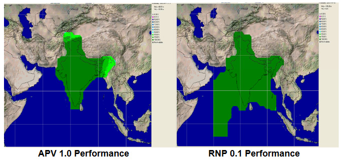 The GAGAN, when operational is designed to achieve a performance level of APV 1.0 over the Indian land mass and RNP 0.1 over the oceanic region, within the Indian Flight Information Region (FIR).
