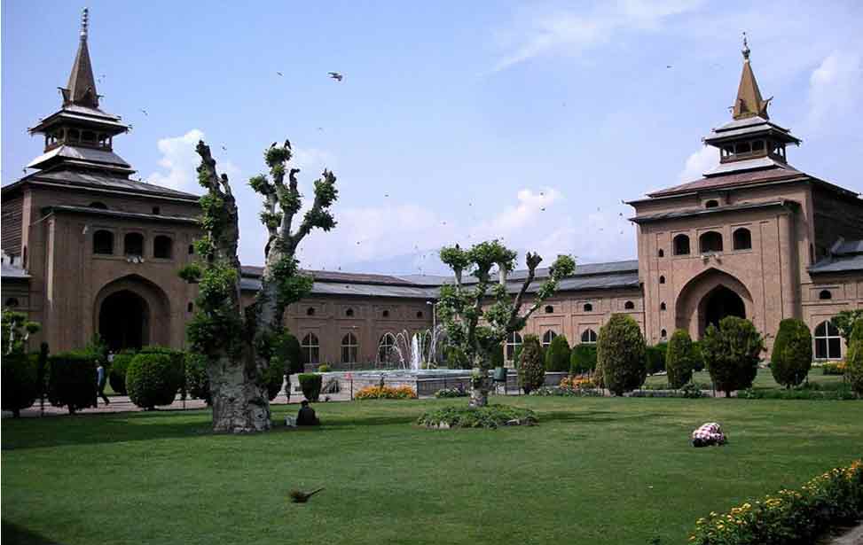 Jama Masjid Mosque is a mosque in Srinagar, Jammu and Kashmir, Kashmir. The Jama Masjid of Srinagar is at Nowhatta, in the middle of the old city. It was built by Sultan Sikandar shah kashmiri shahmiri in 1394 AD Later, the son of Sultan Sikandar, Zain-ul-Abidin got the mosque extended the masurement of masjid is 381 ft by 384 ft built in area of 1,46,000 sqf The attractions of the Jama Masjid with is unique architecture,has mejistic courtyard and 378 wooden Deodar pillars supporting wooden ceiling with 346 pillars of 21 feet in height and 5 feet in girth and 32 pillars with 48 feet in height and 6 feet in girth. Another feature of the mosque is the peace and tranquility inside it, standing out against the hustle of the old bazaars around it.The masjid has a fountain also measurement of 33 feet by 34 feet which is also used for wadu (ablution) Thousands of Muslims assemble at the mosque every Friday to offer their prayers. This Jama Masjid of Kashmir, has seen a number of destructions till date. It got ruined thrice in fire and was reconstructed every time. The last restoration was carried out during the reign of Maharaja Pratap Singh.