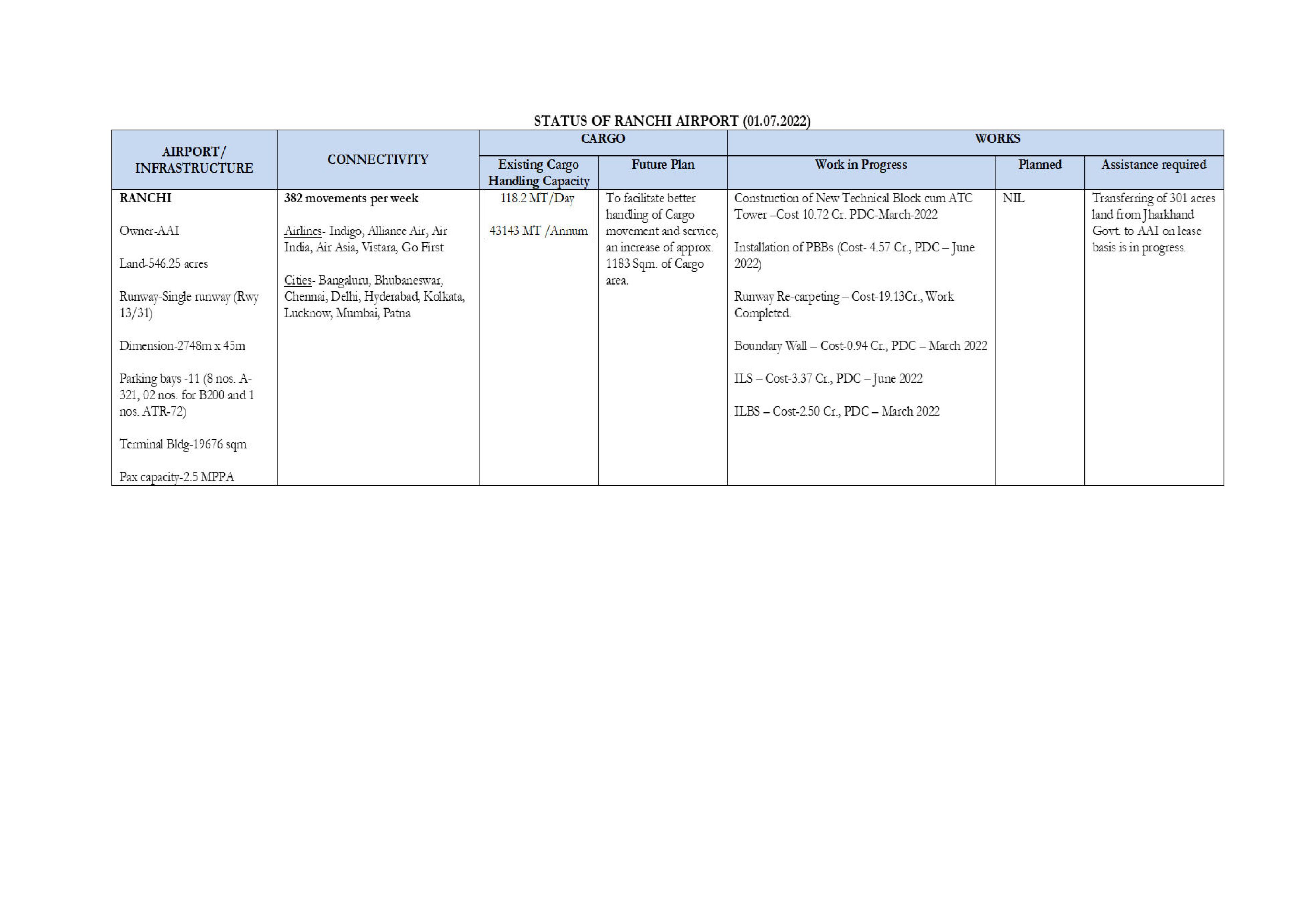 2 STATUS OF RANCHI AIRPORT (01.07.2022) View