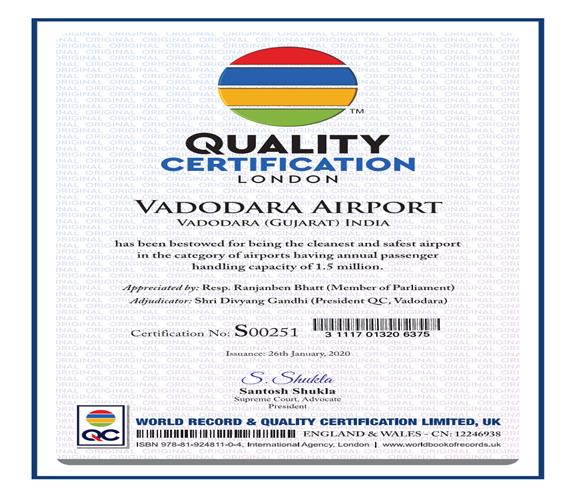 1 Vadodara Airport received Quality Certificate from World Record and Quality Certification Limited, London in January, 2020. -